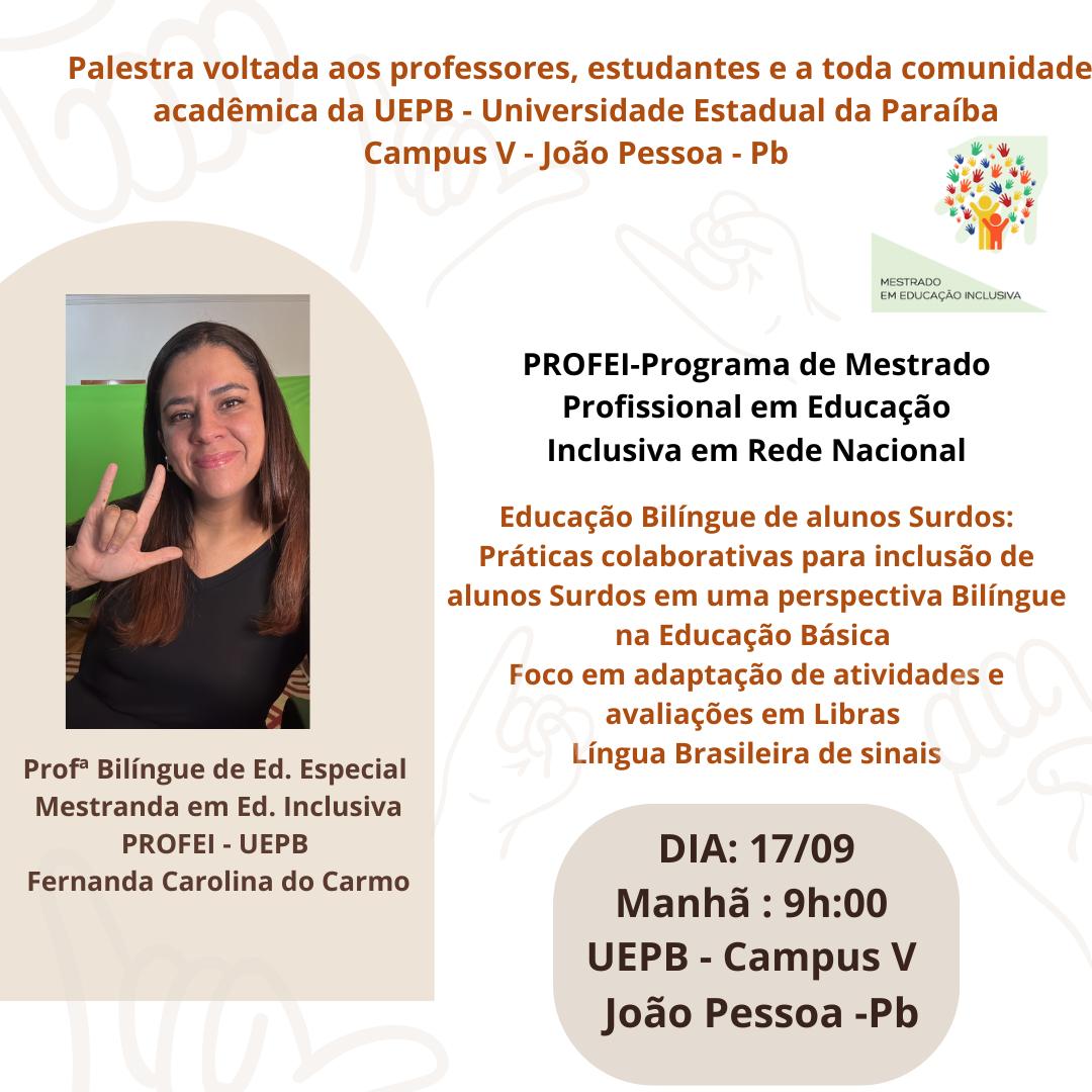 O Mestrado Profissional em Educação Inclusiva (PROFEI) da Universidade Estadual da Paraíba (UEPB) que integra Rede Nacional, promove, na quarta-feira, dia 17 de setembro, às 9h, no auditório do Câmpus V da UEPB, em João Pessoa, a palestra “Educação bilíngue de alunos surdos”, que será ministrada pela professora bilíngue de educação especial e mestranda em educação inclusiva Fernanda Carolina do Carmo.