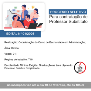 A Coordenação do Curso de Bacharelado em Administração do Centro de Ciências Exatas e Sociais Aplicadas (CCEA), abre seleção pública para contratação de professor substituto. Está sendo oferecida 1 (uma) vaga para a área de Direito, com regime de trabalho T40.