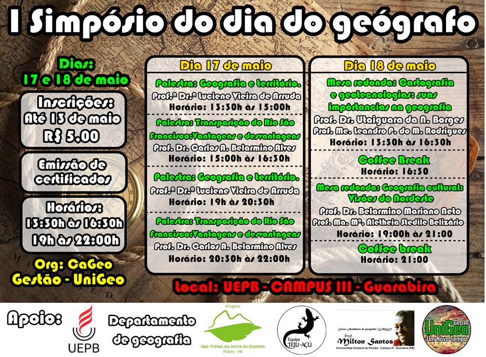 Com o tema “Geografia: território, geotecnologias e cultura”, o Campus III da Universidade Estadual da Paraíba (UEPB), em Guarabira, através do Departamento de Geografia e do Centro Acadêmico Milton Santos, promove o “1º Simpósio do Dia do Geógrafo” nos dias 17 e 18 de maio.